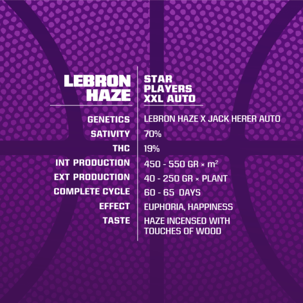 BSF SEEDS presents the autoflowering version of the fastest sativa player in the league, Lebron Haze XXL Auto. It is the result of the crossing of a mother Lebron Haze plant with a male Jack Herer plant of fourth generation. This variety is charecterized by its satility and speed, always maintaining high leves of production and an impressive bouquet.